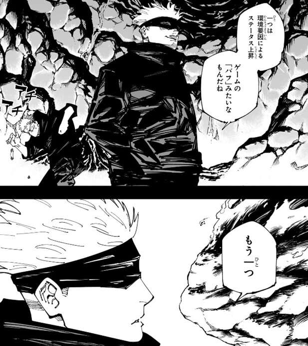 すると第15話で、五条が虎杖に領域展開についてレクチャーする場面へと切り替わります。領域展開は滅茶苦茶呪力を消費するが、利点もあり一つは環境要因によるステータスの上昇、ゲームの「バフ」みたいなもの、と五条は虎杖に説明します。
