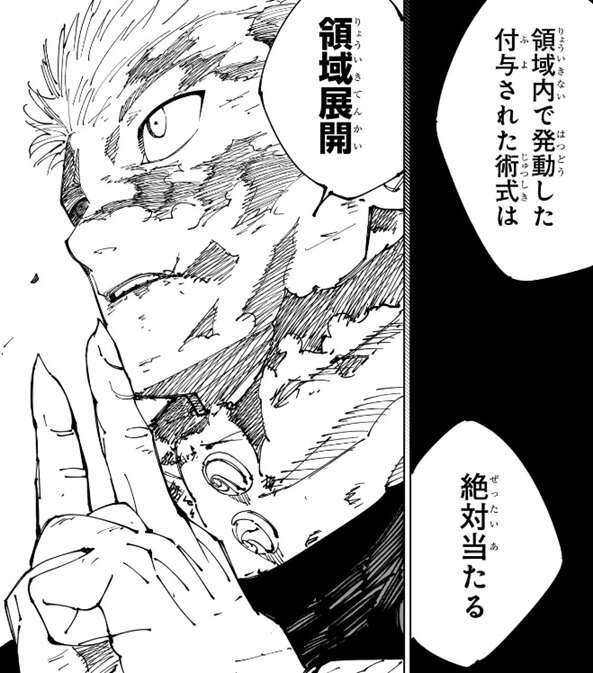 そしてもう一つ、領域内で発動した付与された術式は絶対に当たる、と五条は虎杖に言います。当たらなければ意味はないと判断した宿儺ですが、虎杖は掌印を結び領域展開と唱えます。虎杖は日下部との入れ替え修行により、結界術の基礎を習得していました。