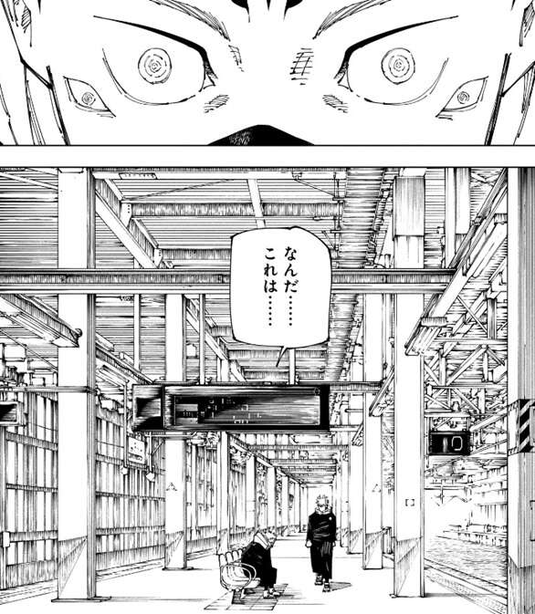 次の瞬間、虎杖と宿儺は駅のホームのような場所にいました。なんだ……、これは……、と戸惑う宿儺ですが、何故か宿儺が虎杖に受肉した時の姿になっています。