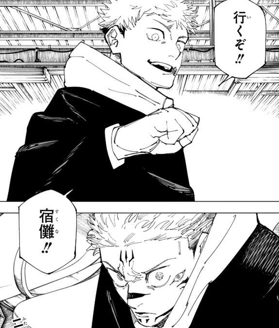 行くぞ!!宿儺!!と声を掛ける虎杖、そんな虎杖を宿儺は睨んでいるようにも見えます。