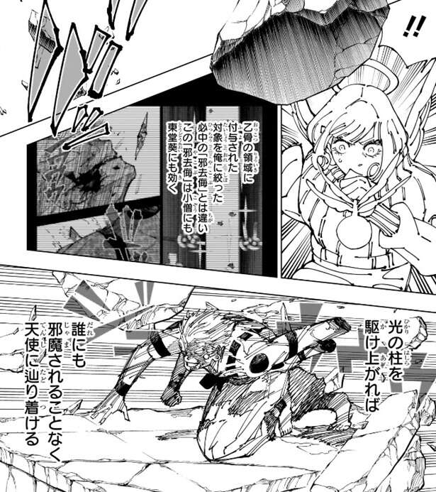 「邪去侮の梯子」が降り注ぐ中、宿儺は足元の道路を殴りつけて道路を破壊します。破壊された瓦礫がいくつも浮かび上がると、宿儺はその瓦礫をいくつか殴って上空へと飛ばします。宿儺はその瓦礫を足場にして光の柱を駆け上がっていきます。乙骨の領域に付与された、対象を宿儺に絞った必中の「邪去侮」とは違い、今回の「邪去侮」は虎杖や東堂にも効きます。虎杖や東堂も「邪去侮」の影響を受けるので術式が使えず宿儺の邪魔は出来ないので、光の柱を駆け上がれば宿儺は天使・来栖を攻撃できます。