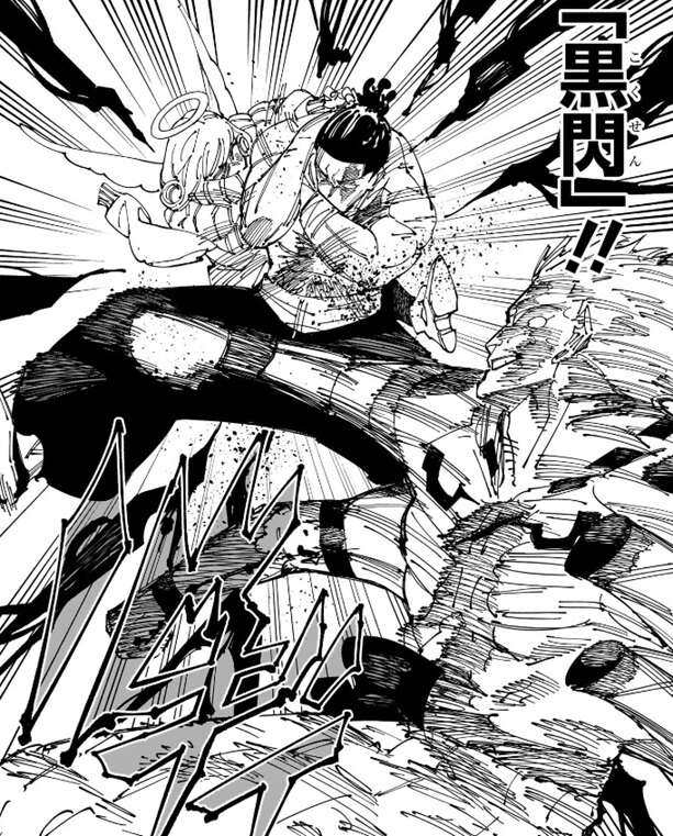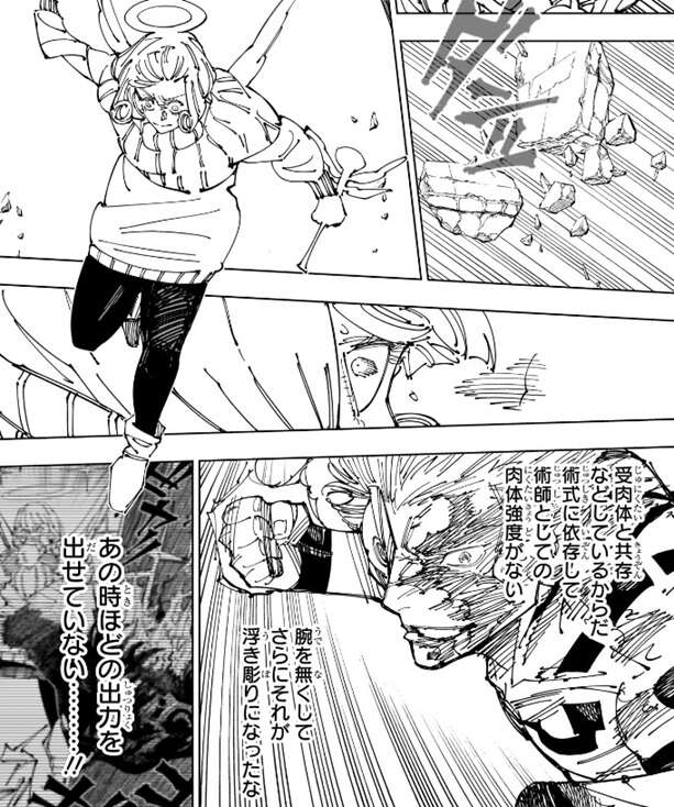来栖は腕を無くしていて、「邪去侮の梯子」の出力は以前ほど出ていないようです。その為、宿儺が光の柱を駆け上がっている間に宿儺を伏黒の肉体から引き剥がす事が出来ず、宿儺は天使・来栖の元までたどり着いてしまいます。一旦、天使・来栖は離れようとしますが、宿儺は天使・来栖を逃がしません。