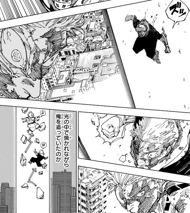 宿儺は行動不能となった二人の止めは後で刺せばよいと考え、先に虎杖を始末しようとします。そこに虎杖が現れ、拳を握り攻撃を繰り出します。虎杖も光の中を焼かれながら、宿儺が作った瓦礫の足場を使って駆け上がり宿儺を追ってきていました。