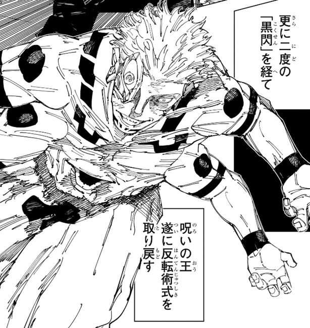 虎杖の攻撃を避けると、宿儺は虎杖の顔面を殴ります。更に二度の「黒閃」を経て、宿儺は遂に反転術式を取り戻します。負傷していた上下左腕と下右腕、さらに腹にあるもう一つの口が復活しています。