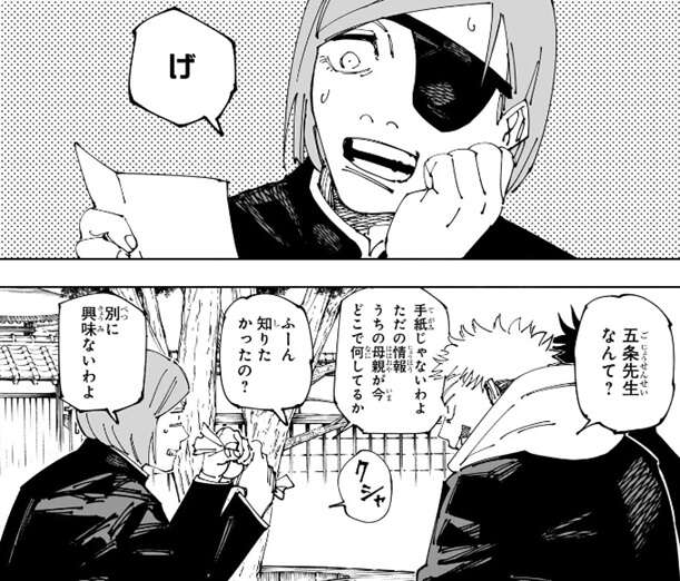 虎杖は「共鳴り」が決まった時ちょっと泣いたと言い、伏黒は驚くも何も宿儺の中で知っていたから冷静に答えて、何事もライブ感で大事ね、と釘崎はつぶやきます。その後、三人は家入が預かっていた五条からの手紙を開封することになります。ただ、手紙は二通しかなく、虎杖の分は直接話したから無いそうです。早速開封する釘崎と伏黒ですが、釘崎の手紙には釘崎の母親が、今どこで何をしているかが書かれていたそうです。別に興味がないと手紙をクシャと潰す釘崎ですが、伏黒は自分の手紙を読んで思わず笑ってしまいます。