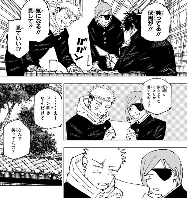 どんな内容かすごく気になる虎杖と釘崎は、伏黒に許可を得てから伏黒の手紙を見てみます。釘崎と似たような事しか書いてねぇよ、と伏黒は言いますが、手紙の内容を見て二人は伏黒にドン引きします。