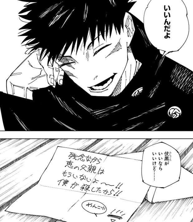 その内容とは、残念ながら恵の父親はもういないよ~!!僕が殺したから!!と言う内容でした。めんご!!という五条の落書きも付いていて、父親を殺したと打ち明ける割には、五条はすごく明るい書き方をしていました。いいんだよ、と伏黒は笑顔で二人に言い、二人も、伏黒がいいならいいけど…、と釈然としない形ですが納得します。