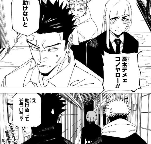 乙骨先輩を助けないと、と虎杖は言いますが、憂太テメェコノヤロー!!という叫び声がどこかから聞こえてきます。乙骨先輩を助けないと皆が言っていますが、伏黒は頭に汗を浮かべつつ、え、助けるってそういう?と、あきれながらつぶやきます。伏黒があきれている事からあまり深刻な感じではなさそうですが、五条乙骨は現在どのような状況なのでしょうか?