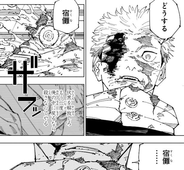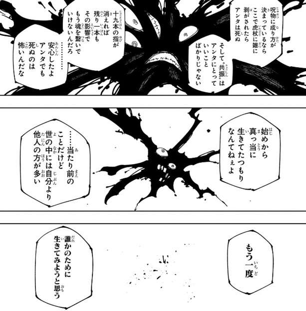しかし伏黒は宿儺に、なんでそんなに必死なんだ?と、指摘します。そして、このまま虎杖に雑に剝がされたら宿儺は死に、一九本の指が消えれば“共振”によって残りの一本もその影響で魂を繋いでいけないんだろ、と伏黒は指摘します。初めから真っ当に生きてたつもりなんてねぇよ、当たり前のことだけど世の中には自分より他人の方が多い、もう一度誰かのために生きてみようと思う、と伏黒は宿儺に生きる意志を示します。すると、伏黒の中の宿儺が小さくなって消えていきます。