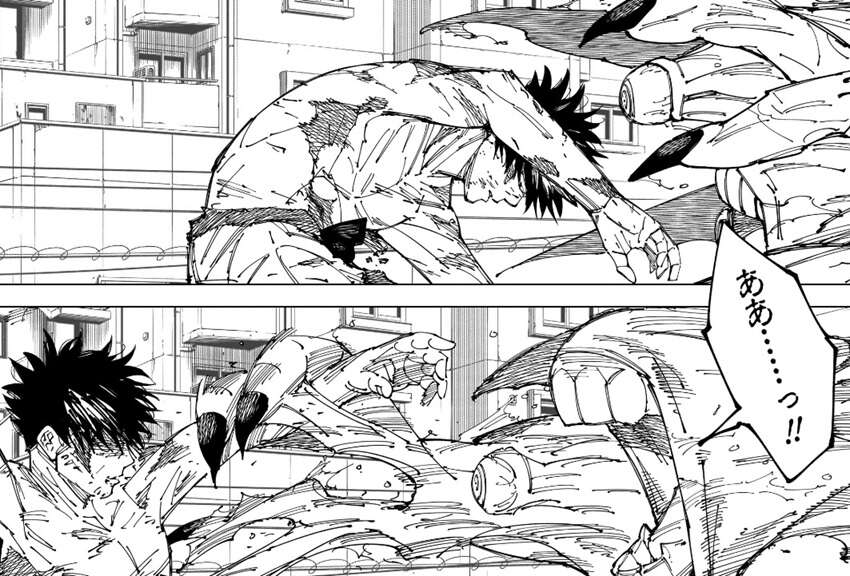 場面は新宿へと戻り、虎杖の領域と思われる黒い塊が崩壊、伏黒の身体から宿儺が剝がされます。伏黒から無理やり剥がされた宿儺は人の形はしておらず、呪霊と呼ぶに相応しい化け物のような姿をしています。