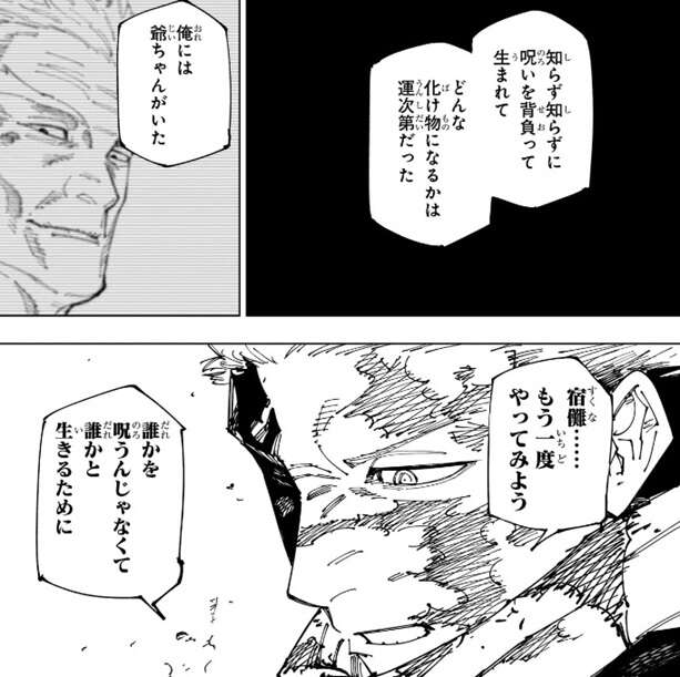 知らず知らずに呪いを背負って生まれて、どんな化け物になるかは運次第だった、しかし自分には爺ちゃんがいた、と虎杖は言います。そして、もう一度やってみよう、誰かを呪うんじゃなくて誰かと生きるために、と虎杖は宿儺に自分と生きていこうと言います。