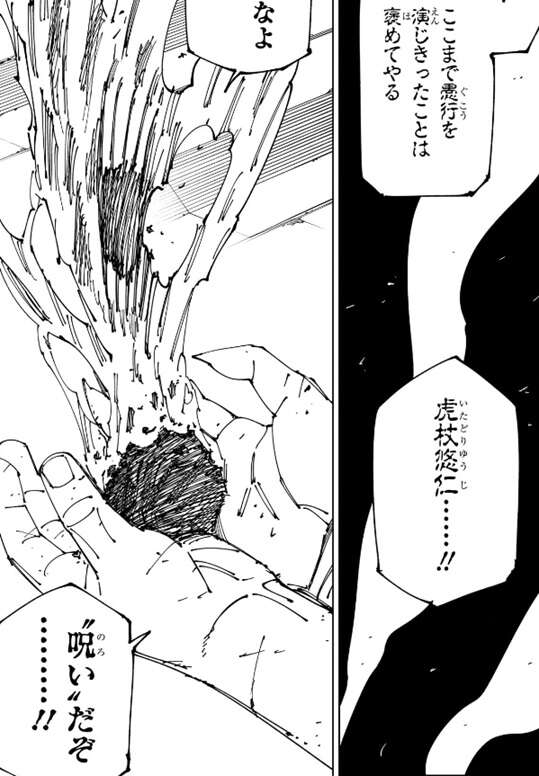 しかし、ここまで愚行を演じきったことは褒めてやる、と宿儺は虎杖を褒めますが、虎杖と一緒に生きていくことを拒否、ナメるなよ、俺は“呪い”だぞ……!!と、言い残すと化け物のような姿となった宿儺は塵となって消えていきます。