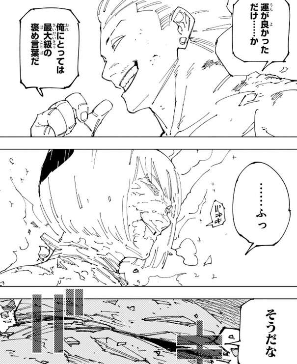 一方、秤と裏梅の戦いに場面は移りますが、秤と裏梅も宿儺が負けたことを感じ取っていました。裏梅は宿儺の敗因を“受肉体であること”と断言し、それ以外あり得ないと言います。そして、運が良かっただけだ、千年遅れて生まれことで命拾いしたな、と裏梅は言いますが、運が良かっただけは俺にとって最大級の誉め言葉だ、と秤は嬉しそうに答えます。秤との会話中、裏梅の首辺りの傷がどんどん凍っていき、最後は裏梅の全身が砕けて消えていきます。