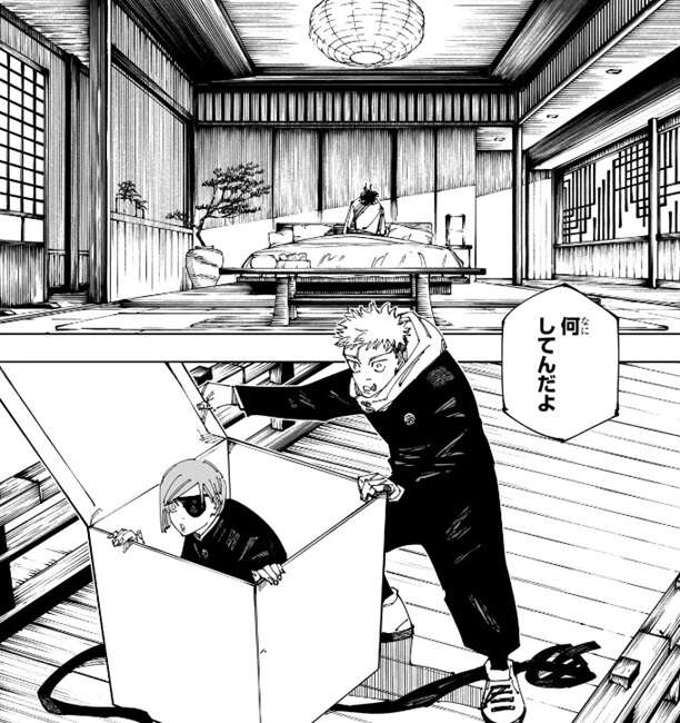 新宿決戦後、伏黒はベッドの上で目を覚まします。伏黒が部屋の外に出てみると、釘崎が箱の中に入っていて、虎杖が箱を閉じようとしていました。