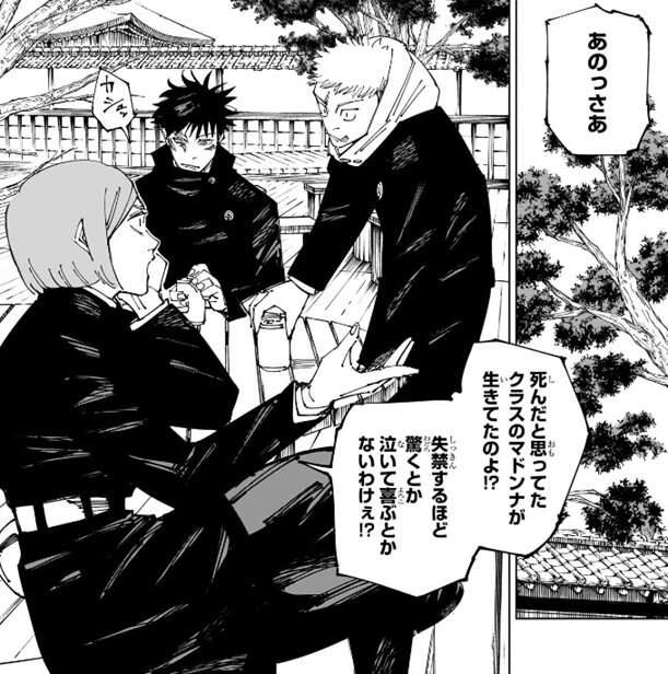 4巻32話の虎杖のサプライズ登場の、釘崎生存ドッキリ版をしようとしていたようですが、伏黒は釘崎が生きていても少しも驚きません。そんな虎杖と伏黒に、釘崎はもっと驚くとか泣いて喜ぶとかないわけ!?と不満を口にします。