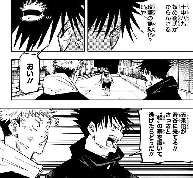虎杖と伏黒は粟坂二良と戦いますが、何度攻撃してもほとんどダメージを与えられず粟坂二良の異常なタフさに苦戦します。伏黒は粟坂二良の異常なタフさには、十中八九 術式が絡んでいると考え、五条悟が渋谷に来ている、と粟坂二良を挑発して様子を見ます。その後粟坂二良の受け答えから、粟坂二良では五条悟に勝てない事、攻撃用でない「脱兎」が粟坂二良に効いた事、などから伏黒は粟坂二良の術式の正体を推測します。