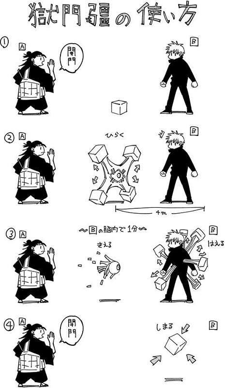 おまけで獄門疆の使い方が説明されています。獄門疆は、Aが開門と言うと開いて中央の目が封印する対象のBを捕捉します。その後Bの脳内で1分が経過すると、Bの身体から獄門疆の一部が生えてきます。そしてAが閉門と言うと、封印する対象Bを獄門疆の内部にしまって、キューブ状の形に戻り封印完了です。