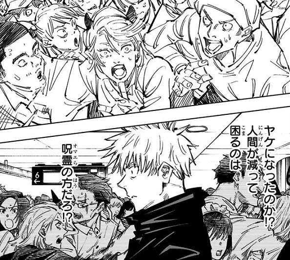地下五階に到着した電車の中から大量の改造人間と真人が現れ、一般人はさらに混乱し逃げ惑います。さらに雑草が塞いでいた吹き抜けが開き、そこからも大量の一般人が投入され、さらに真人、脹相、漏瑚が同時に五条悟を攻撃、五条悟はさらに追い詰められます。