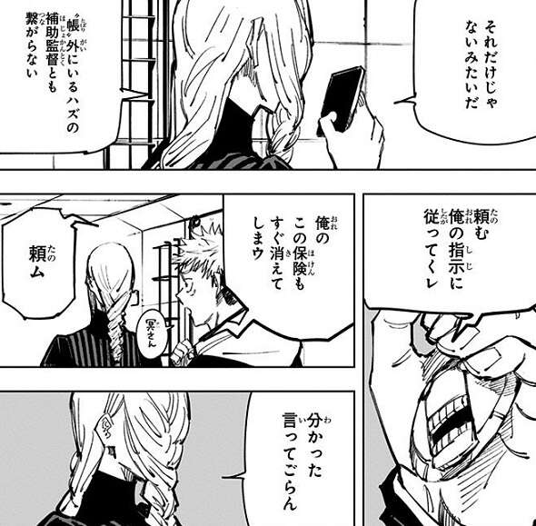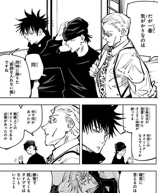一方、虎杖は七海班と合流し、地下五階の状況や五条悟が封印されている状況を七海に伝えます。七海は猪野、虎杖、伏黒の三人に、“術師を入れない帳”を解いて欲しいとお願いをします。