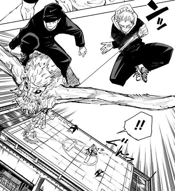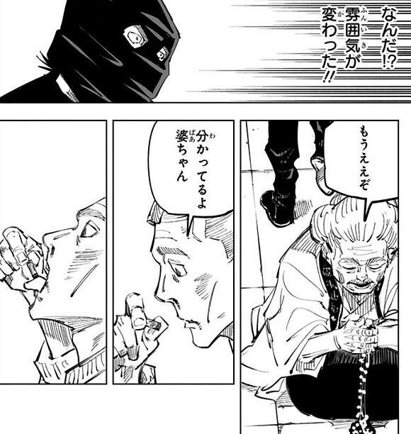 猪野はビルの屋上に残ったオガミ婆とその孫と対峙します。猪野は降霊術「来訪瑞獣(らいほうずいじゅう)」を使いオガミ婆を倒そうとしますが、孫がオガミ婆を身を挺して守るため、オガミ婆に攻撃が当たりません。孫がオガミ婆を守っている間に、オガミ婆は「禪院甚爾」の肉体を孫に降ろして、「禪院甚爾」の肉体を復活させます。