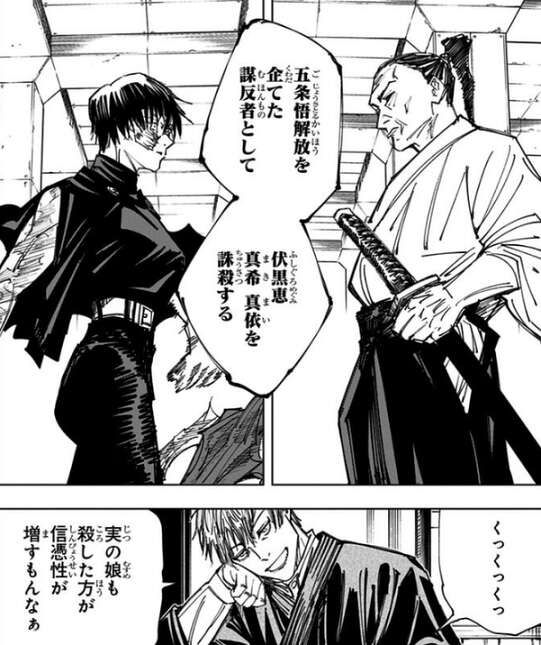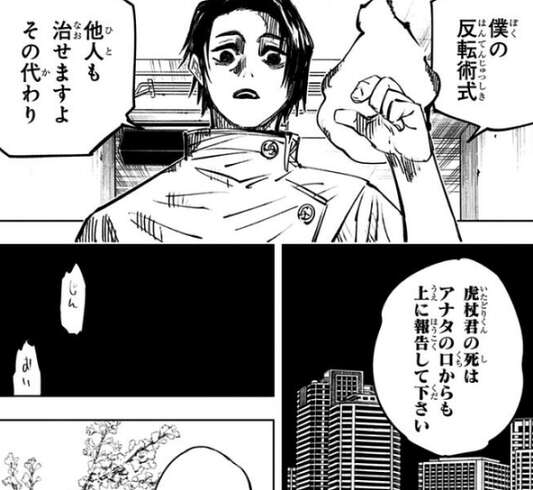 脹相の超新星をくらってしまった禪院直哉は、脹相の血を浴びてしまった影響で身体にダメージを負ってしまいます。結局、禪院直哉は乙骨憂太の反転術式で治してもらう代わりに、虎杖の死を上に報告するように言われます。一方、乙骨憂太の襲撃を受けた虎杖は、父親と祖父が言い争っている夢を見ます。