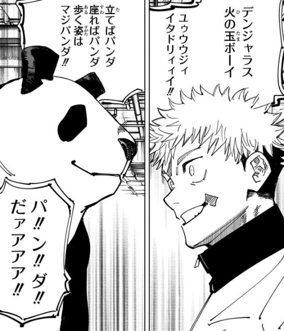 三年の秤金次を連れてくるように言われた、虎杖達は栃木県の立体駐車場跡地に向かいます。秤金次は立体駐車場跡地でかけ試合の胴元をして金を稼いでいて、虎杖が賭け試合に出場して潜入し内側から秤金次と接触できないか探りを入れることにします。賭け試合に出場する虎杖ですが、対戦相手は何故か先に潜入していたパンダでした。