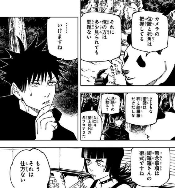 虎杖とは別行動をとることにした伏黒は、駐車場に潜入し屋上のモニタールームに近づこうとします。途中でパンダと合流しますが、パンダからモニタールームには星綺羅羅の術式のせいで近づけないと言われます。伏黒とパンダは秤金次の説得は虎杖に任せることにして、虎杖が話す時間を稼ぐために立体駐車場をコッソリ制圧して扉の前を固めることにします。