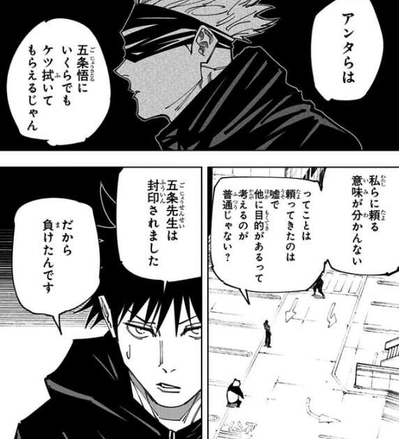 立体駐車場をコッソリ制圧したもの伏黒とパンダは星綺羅羅に見つかってしまい、秤金次に異常事態を連絡されてしまいます。伏黒は星綺羅羅を説得しようと、未曽有の呪術テロがあり秤金次の協力が必要だと状況を説明しますが、星綺羅羅は自分たちでなく五条に頼るように言います。五条は封印されてしまっていると伏黒は説明しますが、星綺羅羅は五条が封印された話を信じようとしません。