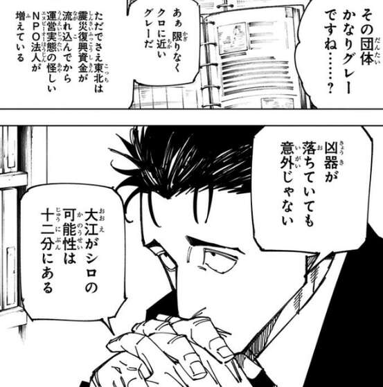 虎杖達は自分達もルールを追加するために、100点以上ポイントを持っていてルール追加をする気がないプレイヤーを探し出そうとします。虎杖のコガネに、100点以上ポイントを持っているプレイヤーを検索するよう言ったところ、東京第1結界に日車寛見、東京第2結界に鹿紫雲一というプレイヤーがいて、それぞれ100点以上ポイントを持っている事が分かりました。その日車寛見は死滅回游に参加する前は弁護士をやっていて、難しい事件の刑事弁護を引き受けていました。