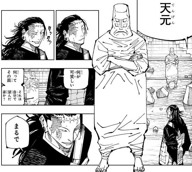 天元と九十九は、12年前の天内理子との同化に失敗した、その後のことについて会話をしていました。その会話の中で九十九由基が元・星漿体である事が判明します。そして、天元と九十九が同化についての会話をしていると、薨星宮直上に羂索が現れます。羂索は結界を破って薨星宮に侵入しますが、そこには脹相がいて羂索を迎え撃とうとしていました。羂索は既に死滅回游は役割を終え、同化前の慣らしが済んだことを脹相に告げます。そして羂索は、見せてあげるよ、終わりの可能性その一つを、と言うと、天元と日本の非術師の同化がどうなるかをスクリーンのようなものに映し出します。