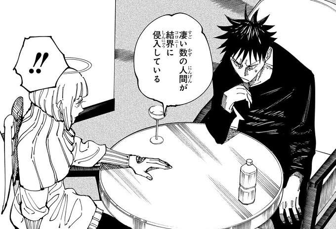 “天使”が殺したいと言っている標的“堕天”は自分だと、宿儺は自ら虎杖に打ち明けます。宿儺の真意が分からず、虎杖は伏黒にだけ“堕天”が宿儺だという事を打ち明けます。虎杖は自分が死ねば、半分以上の宿儺が消えて五条も復活できると思い、いつでも死んでやると心の中で決意します。一方、伏黒は虎杖が既に自ら命を投げ出す覚悟が出来た事を察します。虎杖や伏黒が“天使”や“堕天”の事を考えていると、凄い数の人間が結界(コロニー)に侵入している、と天使が教えてくれます。