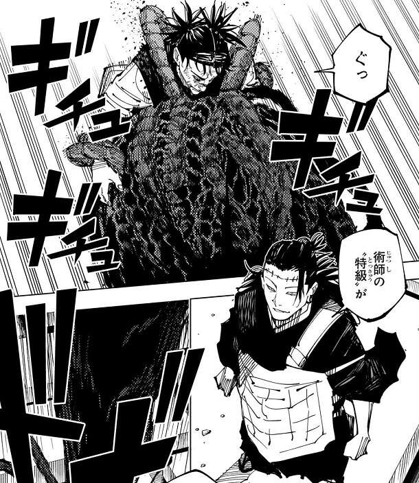 脹相が羂索に呪霊操術以外の何らかの術式を使わせたところで、九十九が参戦します。脹相は力尽きて結界から退場していき、九十九と羂索の一騎打ちが始まります。羂索は“あらゆる障害”取り除くという特級呪霊を使って九十九を攻撃しようとしますが、九十九は“凰輪(ガルダ)”と呼ぶ自身の式神を使って攻撃、特級呪霊を一撃で撃破します。さらに九十九は、自らに仮想の質量を付与する術式・“星の怒り(ボンバイエ)”を使って羂索を直接殴り、空性結界の外まで吹っ飛ばします。