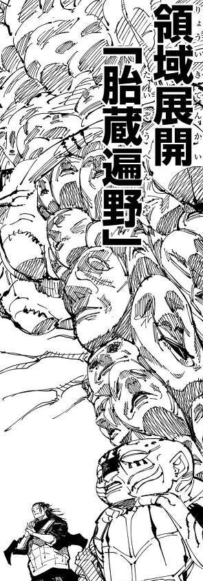 九十九と天元は事前に、羂索に自ら領域を展開させてその領域を天元が解体し、その後術式が焼き切れた羂索を九十九が叩くという作戦を立てていました。しかし、羂索の領域展開「胎蔵遍野(たいぞうへんや)」は、宿儺が渋谷で見せた結界を閉じずに領域を展開し術式を発動する離れ業で、解体すべき外殻がありませんでした。