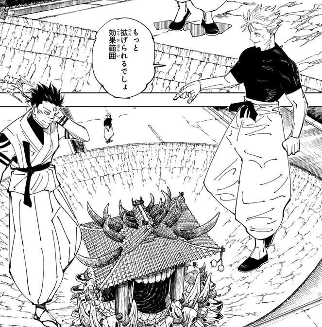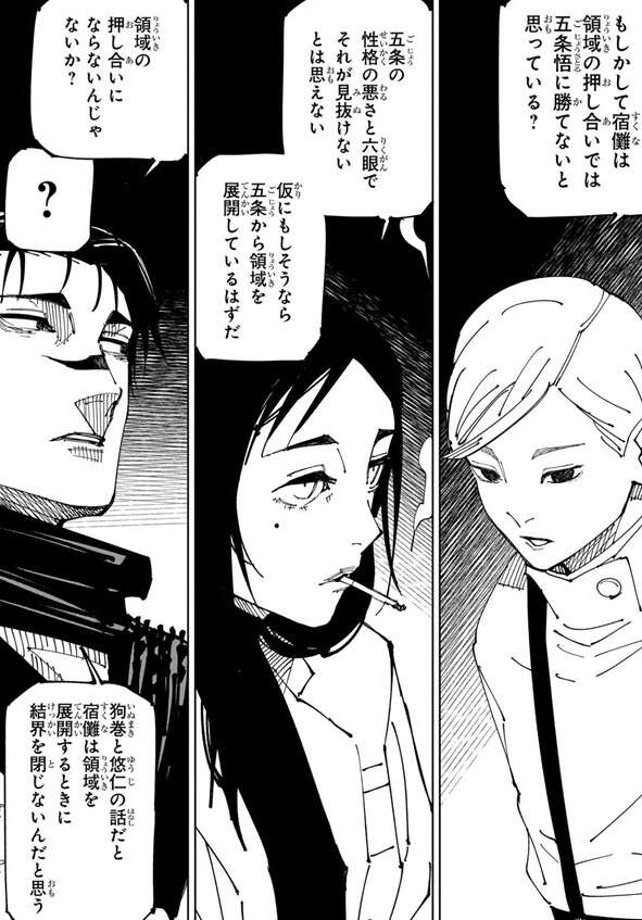 別の場所にいる高専メンバーが、なぜ五条と宿儺が領域展開をしないかを議論をしていますが、そんな議論の最中で突然、二人は同時に領域展開を行います。五条と宿儺の領域の押し合いは結界内では互角ですが、宿儺の領域の効果範囲は五条の領域の外殻より外側に達します。そして、領域の結界は外側からの攻撃に脆く五条の領域は外側から攻撃され、破壊されてしまいます。