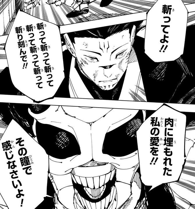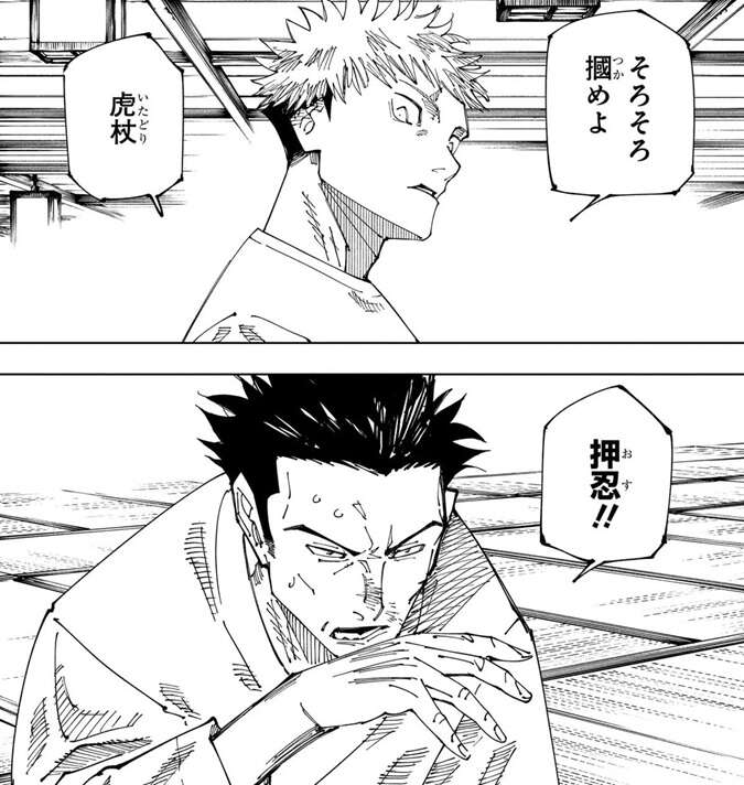 決戦の日を12月24日に控えて、宿儺は見つからない最後の一本を除く残りの指を全て取り込んで、五条との決戦に備えます。さらに、羂索が見つけた宿儺の体も取り込んで、足りない宿儺の指一本分の代わりとします。一方、高専側も宿儺との決戦に備えて準備をしていました。虎杖は日下部と肉体を入れ替えたようで、何かの特訓に打ち込んでいました。
