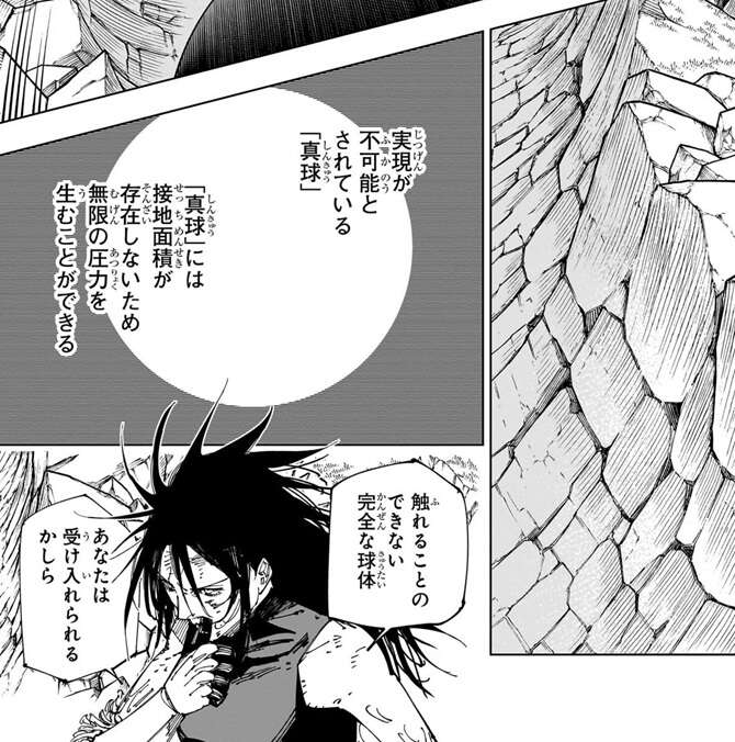 万は平安時代の出来事を思い出しながら、宿儺を殺して宿儺の孤独を独り占めしたいと考えます。万は構築術式で「完全な球体」、「真球」を作り出し、さらに領域展開「三重疾苦(しっくしっくしっく)」を使用します。万の領域には、触れることが出来ない「真球」が必中効果として付与されており、このままでは「真球」による無限の圧力で宿儺は消えてしまいます。領域・三重疾苦に対抗するために宿儺が伏魔御廚子を使うと万は思っていましたが、領域を展開しない宿儺に万は驚きます。そして、宿儺は伏魔御廚子でなく八握剣異戒神将魔虚羅(やつかのつるぎいかいしんしょうまこら)を召喚します。