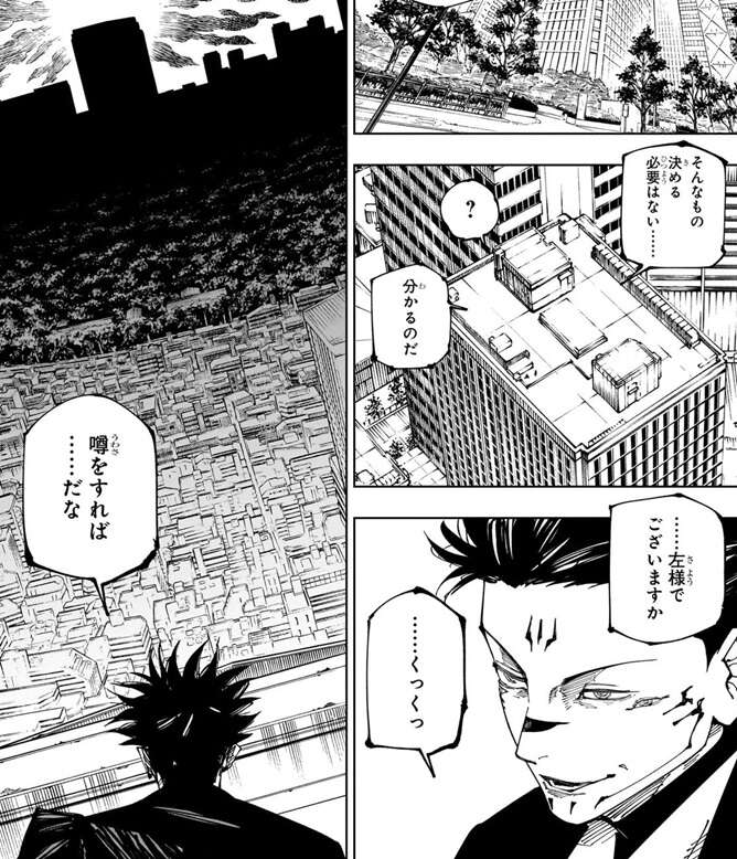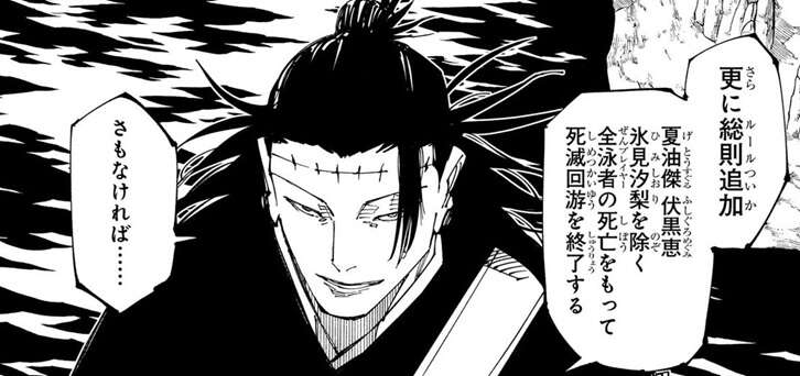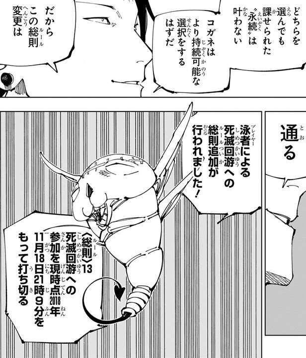 羂索は死滅回游の新規プレイヤーの参加を打ち切るルールを追加するように、コガネに要求します。しかし、この追加ルールはルール7に抵触するとコガネは言い、ルール追加を却下します。ここで羂索は浄界を破壊し死滅回游を強制終了するとコガネを脅し、追加ルールを無理やり通します。