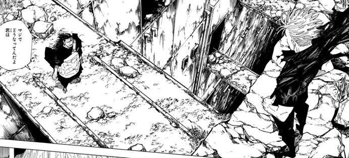 初撃の虚式「茈」は宿儺にダメージを与えましたが、宿儺はすぐに反転術式で回復、五条と宿儺は激しい近接戦闘を開始します。五条は無下限呪術で宿儺を攻撃、宿儺も斬撃で五条を攻撃します。二人は余裕でお互いの攻撃をかわしますが、新宿の高層ビルは二人の近接戦闘の余波で瓦礫の山となってしまいます。