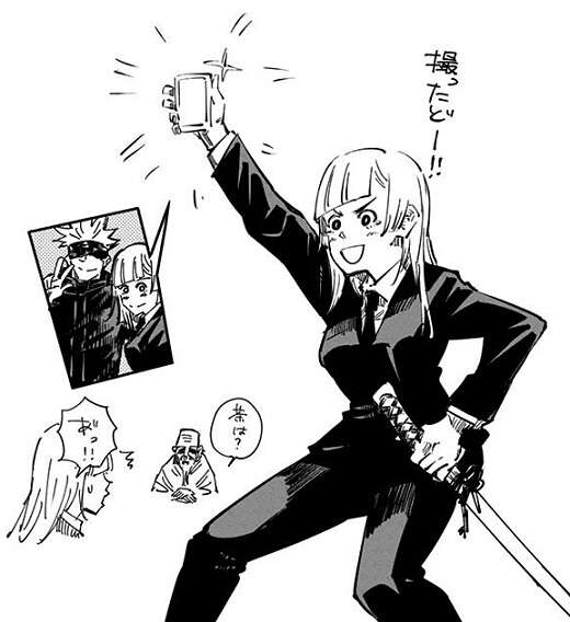 京都校の三輪霞は五条悟のファンだったようで、第18話では五条と楽巌寺学長が話をした後、部屋から出て行った五条を追いかけていき、一緒に写真を撮ってもらおうとしていました。このおまけを見ると、その後無事に五条と写真を撮ってもらえたようです。興奮しすぎて、楽巌寺学長にお茶を買うのを忘れてしまっていますが…。