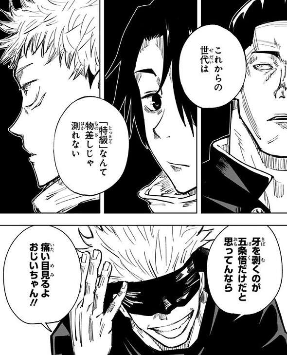 一方、五条悟は京都校の楽巌寺学長に、昨晩未登録の特級呪霊2体に襲われたことを告げ、今後どうしようもなく大きくなった力の波が押し寄せてくる事を予言します。さらに敵だけでなく秤に乙骨、東堂など生徒のレベルも近年急激に上がっていると五条は言い、これからの世代は「特級」という物差しでは測れない事を告げます。
