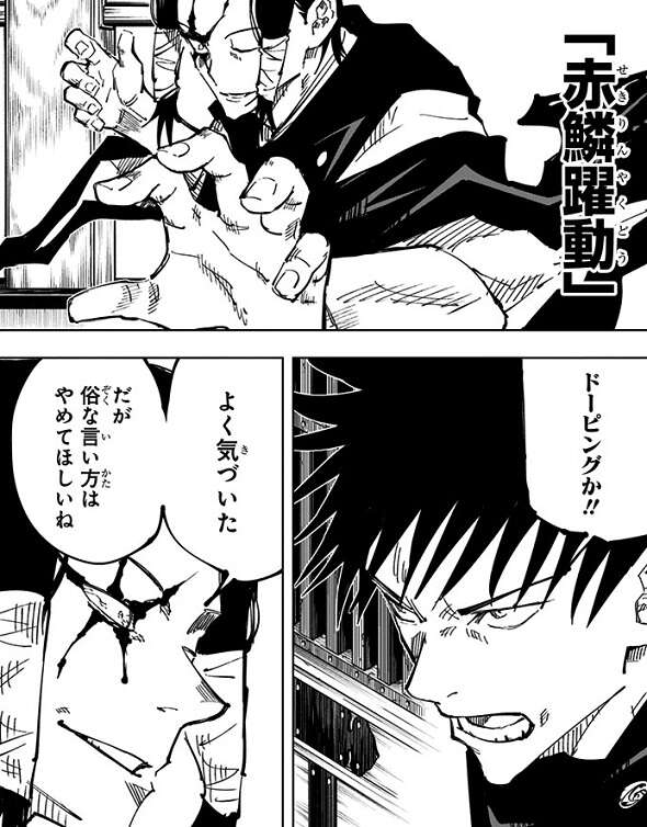 東堂に呪力が遅れる理由は、呪力を“流している”からと言われ、虎杖は呪力の流し方についてアドバイスしてもらいます。それによって虎杖は何かを掴み、さらに東堂から実戦で指導してもらいます。