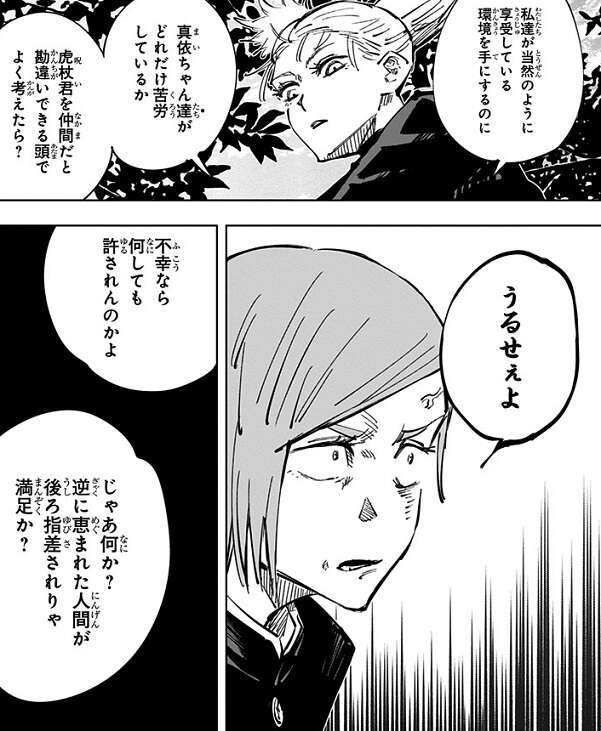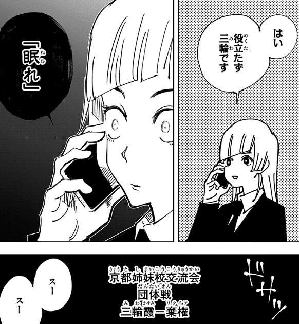 以前真依から、真希は呪いも見えない呪具振り回すだけの一般人、万年4級、と聞いていて安心していましたが、実際に真希と対決し、真希が無茶苦茶強いことに驚き、嘘を教えた真依を恨みます。シン・陰流 簡易領域で何とか真希の隙を作ろうとしますが、真希には隙を作ろうとしている事を見抜かれてしまい、折った大刀と暗器を投げつけられ、間合いを詰められてしまいます。