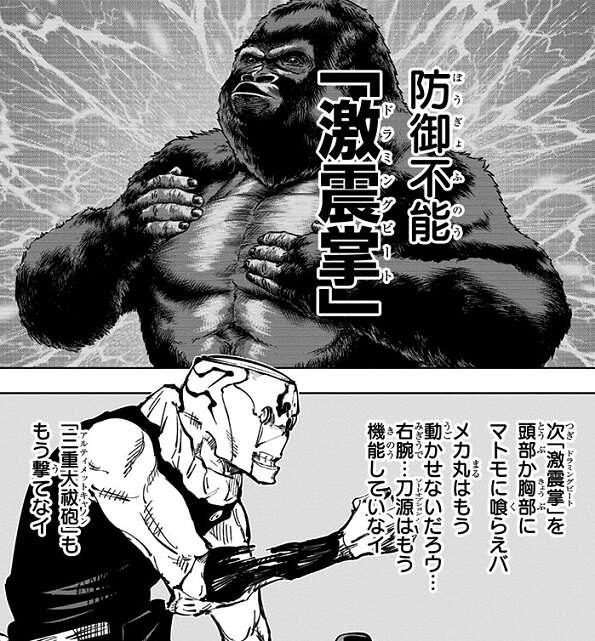 3つの核を持つパンダは、短期決戦パワー樹脂のお兄ちゃん“ゴリラ核”に入れ替えることでゴリラモードとなり、ゴリラモードの得意技、防御不能の激震掌(ドフラミングビート)でメカ丸を追い詰めます。メカ丸は近接戦闘に持ち込み、パンダの核を0距離射撃で仕留めようとしますが、パンダは呪力操作で核の位置をごまかし、逆にメカ丸の頭部に打撃を与えて行動不能にします。メカ丸に勝利したパンダは、メカ丸の携帯を借りて連絡を取り、虎杖達を助けに向かいます。