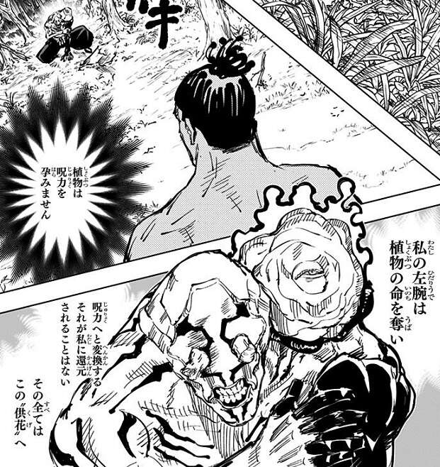 虎杖の黒閃 5発に加えて、游雲に東堂の呪力を上乗せした打撃を急所に与えますが、それでも花御を倒しきれません。花御は“供花”を使って植物の命を呪力へと変換させ、さらに領域展開を使用しようとします。その時、五条が帳を破って結界の中に侵入、参戦してきます。