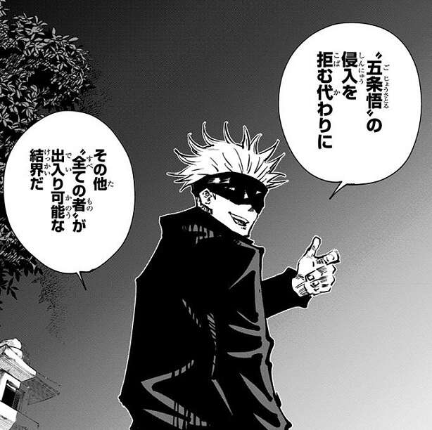 呪詛師・組屋鞣造が使った嘱託式の帳は、“五条悟”の侵入だけを拒むもので、その他“全ての者”は出入り可能な結界でした。五条が結界内に入れない間に、花御は伏黒、狗巻、加茂憲紀を襲い殺そうとします。