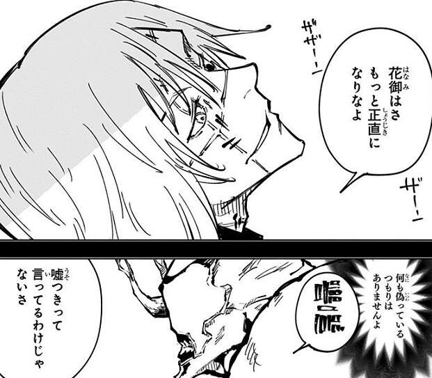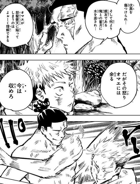 黒閃をキメるまで手を出さない、と東堂に言われ、虎杖は花御を相手に一人で戦いますが、“怒り”によって呪力が乱れ、黒閃をキメることが出来ません。しかし東堂にその事を指摘され、さらにビンタで気合を入れられたことで、虎杖は花御相手に実戦の中で黒閃をキメることに成功します。