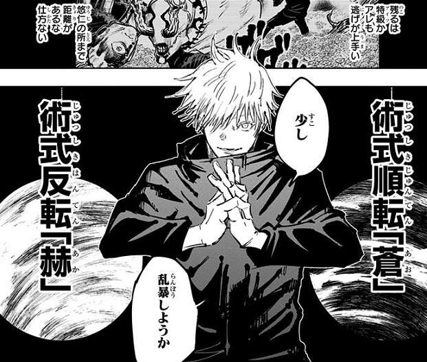五条は楽巌寺と戦っていた組屋鞣造を瞬殺し、一瞬で捕縛します。次に五条を倒そうとしますが、五条の参戦を察知した花御はすぐに退こうとします。しかし、五条は術式順転「蒼」と術式反転「赫」の力を衝突させ、生成された仮想の質量を押し出す術式・虚式「茈」を使用、森を広範囲にわたって深く抉り花御を倒します。しかし五条が呪霊や呪詛師を倒した頃、真人は高専に潜入、保管していた特級術物を奪っていました。