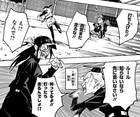 交流会・二日目は個人戦ではなく、急遽野球をすることとなりますが、野球のルールを知らない者もおり、なかなか得点が入りません。出場出来ないメカ丸に変わり、ピッチングマシーンが京都校のピッチャーを務めたり、人数不足の為京都校の外野手1名のみ呪術が使用可となったりと、荒れた試合展開となりますが、最後は虎杖がホームランを放ち、東京校が勝利します。