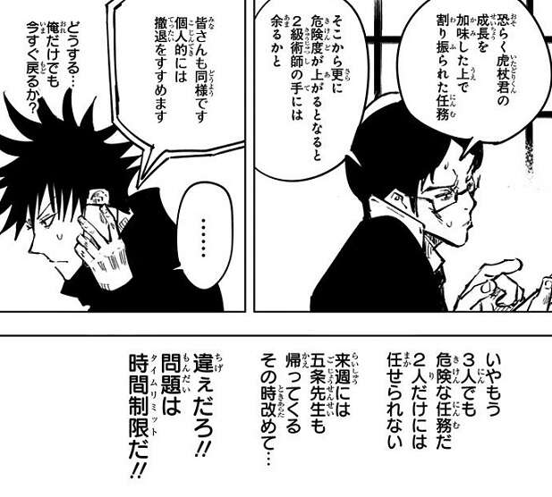虎杖達は八十八橋で調査を進めますが、呪霊の残穢も気配まるで感じられず調査は行き詰ってしまいます。その時、伏黒の同級生の少女が伏黒に会いに来て、同級生の少女も同じような現象に悩まされていて、さらに伏黒の姉で現在寝たきりとなっている津美紀も中学の時に、八十八橋に行っている事が判明します。伏黒は津美紀も呪霊の殺されるかもしれないと分かり、激しく動揺します。