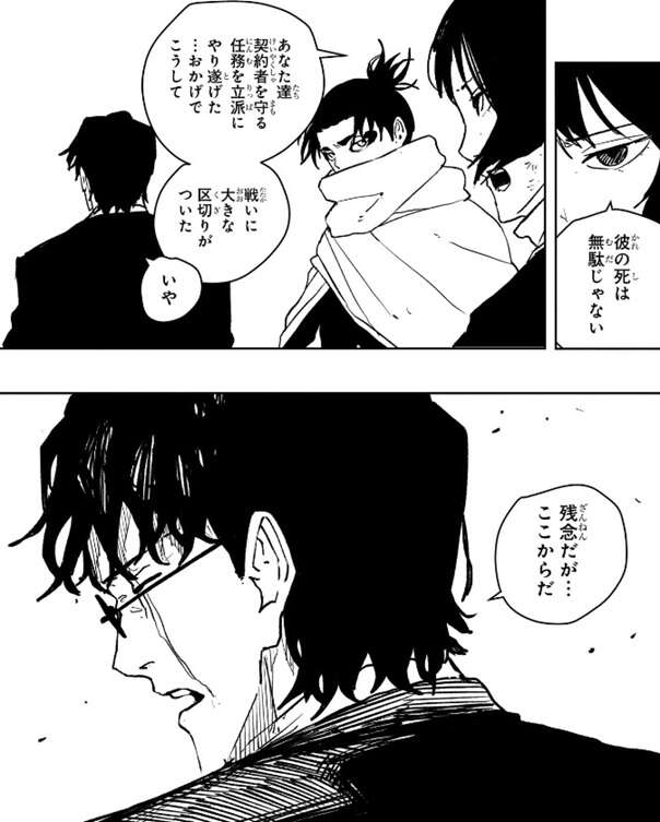 女の巻墨は、彼の死は無駄じゃないと言い、戦いに大きな区切りがついたと座村と漆羽に言います。しかし座村は複雑な表情をした後、残念だが、ここからだ、と意味ありげにつぶやきます。